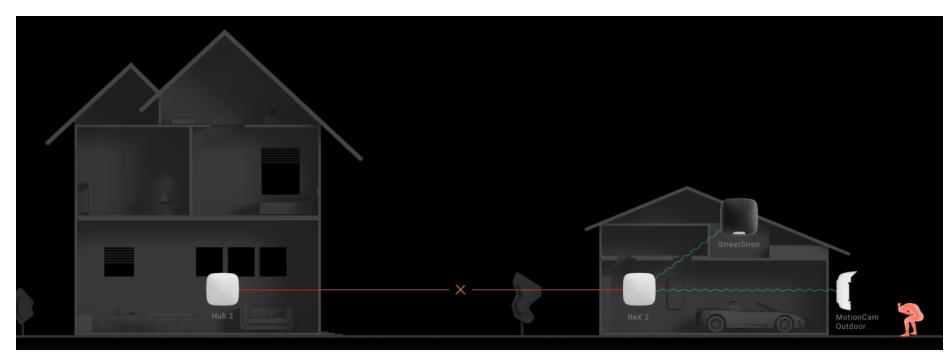 When signal range is effected by mass concrete and steel then connect a Range Extender via ethernet either directly Hub to ReX or via network switch. Alarm events will be prioritised to be sent to the HUB via the ethernet cable in these instances.